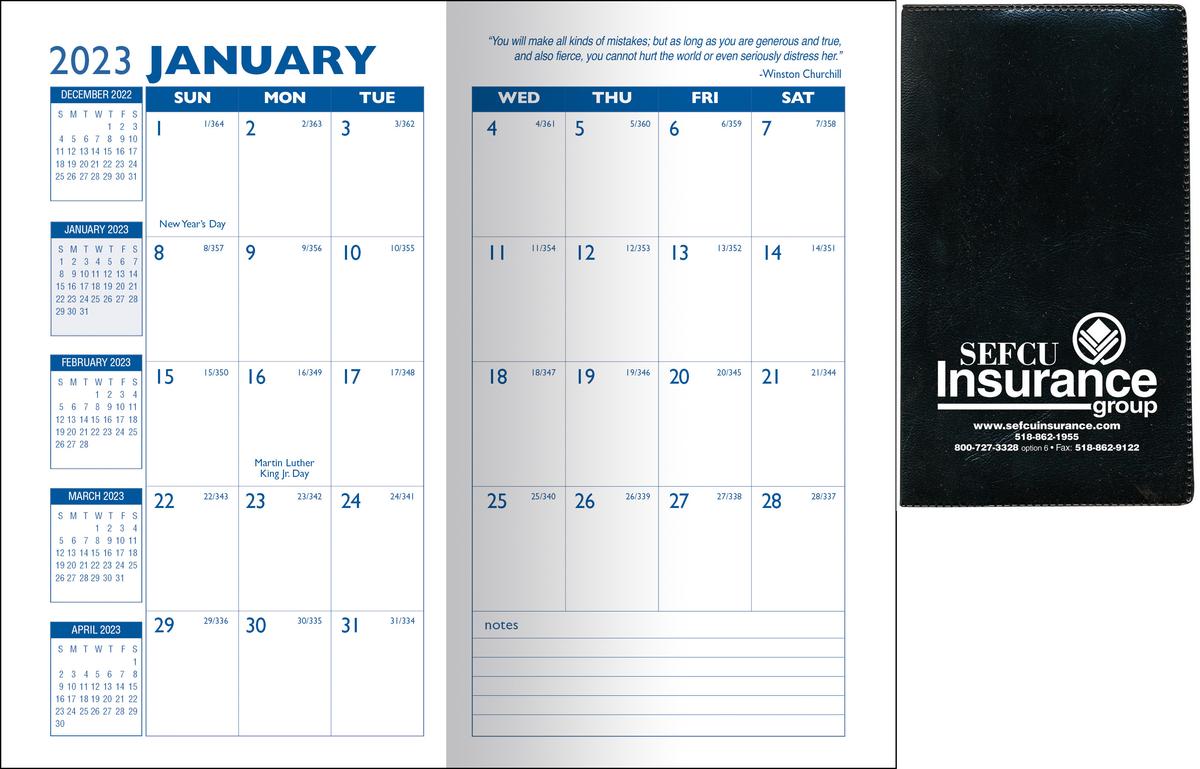 Stay effortlessly organized with the Monthly Pocket Planner 2023 from SuperiorPromos.com. This planner features 32 pages, displaying one month on a two-page spread. Printed in blue, it spans 14 months, from December through to January. It includes pages for important phone numbers and dates, advance planning sections, metric conversion charts, time zone charts, area code tables, and an important holidays page. Available in Navy, Hunter Green, Black, and Burgundy.