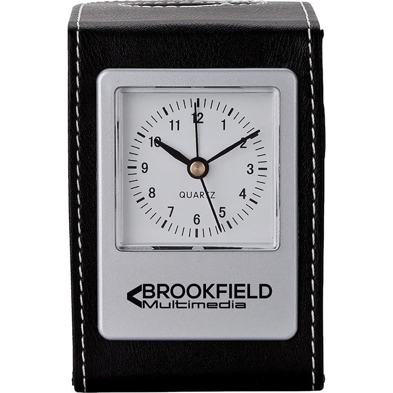 Upgrade your workspace with the Alba Desk Clock & Pen Cup from SuperiorPromos. This sophisticated leatherette desktop alarm analog clock features elegant white contrast stitching that complements any office decor. Equipped with a handy pen cup, this stylish and functional piece keeps your desk organized while offering easy timekeeping. The included AG13 / LR44 battery ensures you can start using it right away. Perfect for professionals who value practicality and style.
